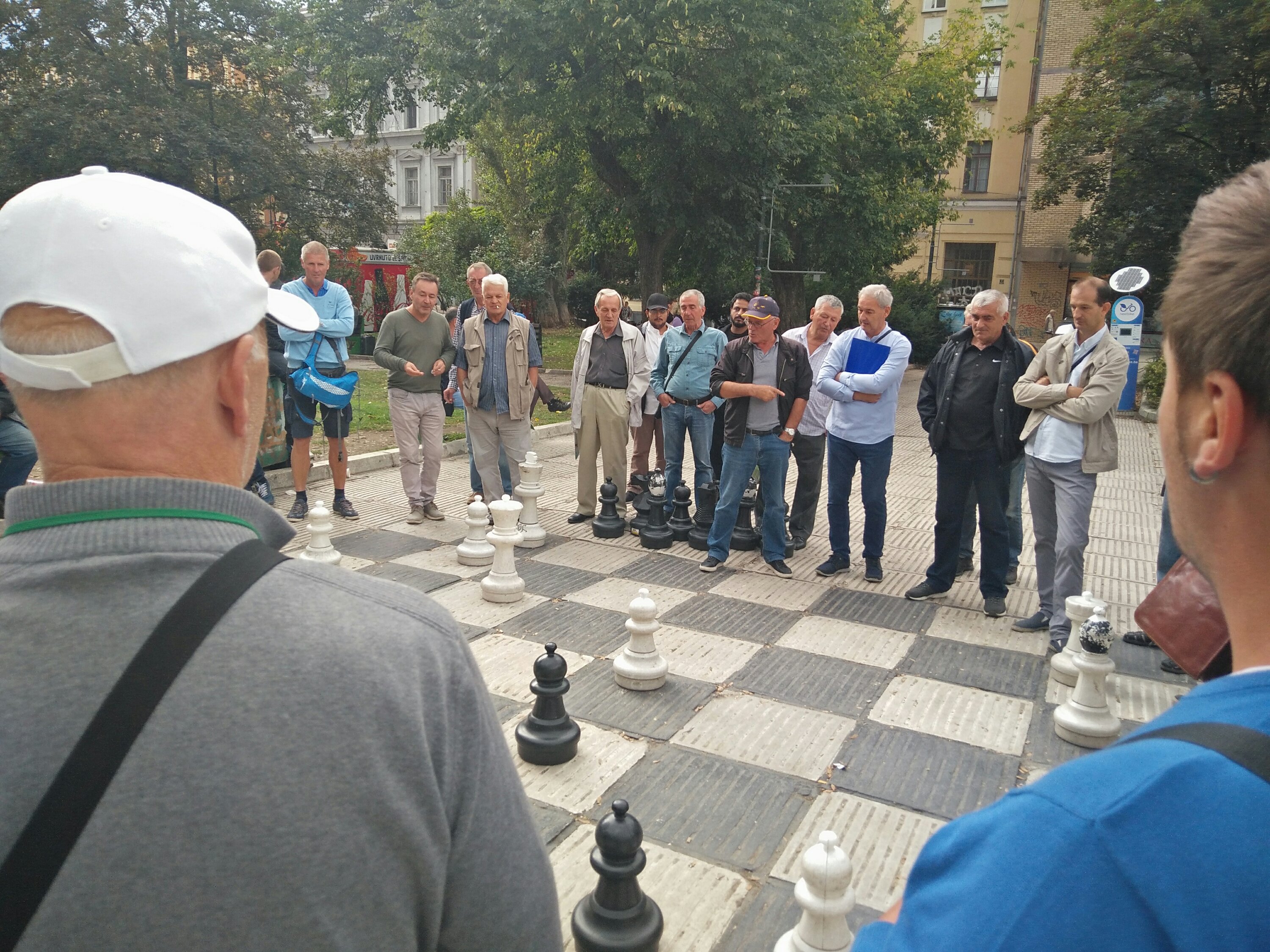 Hier wird nicht einfach nur gespielt, es gehört eine ordentliche Portion Trash Talk (hier überwiegend von weiß) bzw. die Godzilla-Taktik (schwarz stampfte bei jedem Zug einschüchternd übers Brett) dazu. Und die Zuschauer müssen ebenfalls kräftig kommentierten und schimpfen, sonst macht’s ja keinen Spaß! Gewonnen hat dann übrigens weiß – das Trashtalken sollte also im Repertoire eines ernsthaften Schachspielers nicht fehlen!