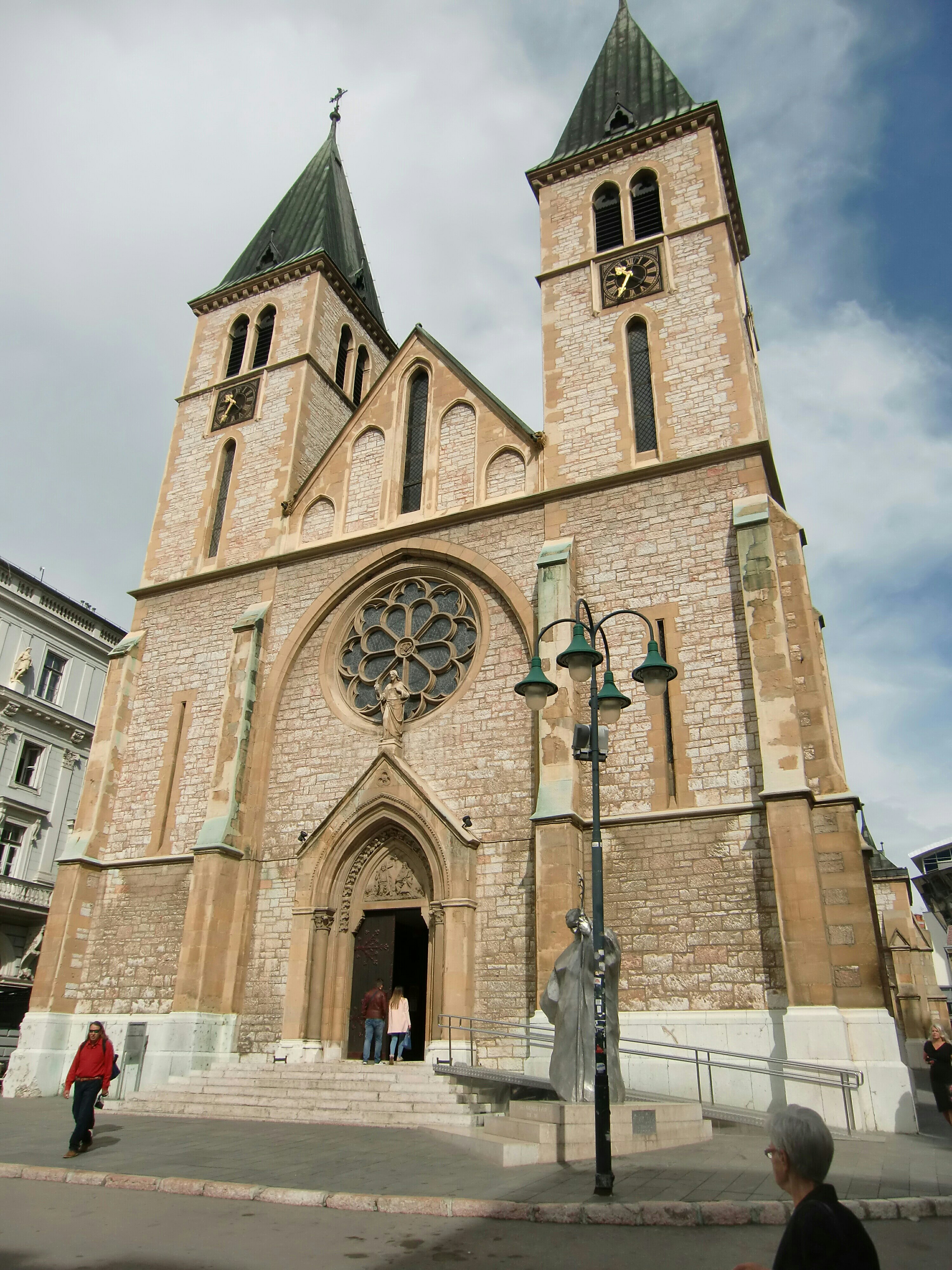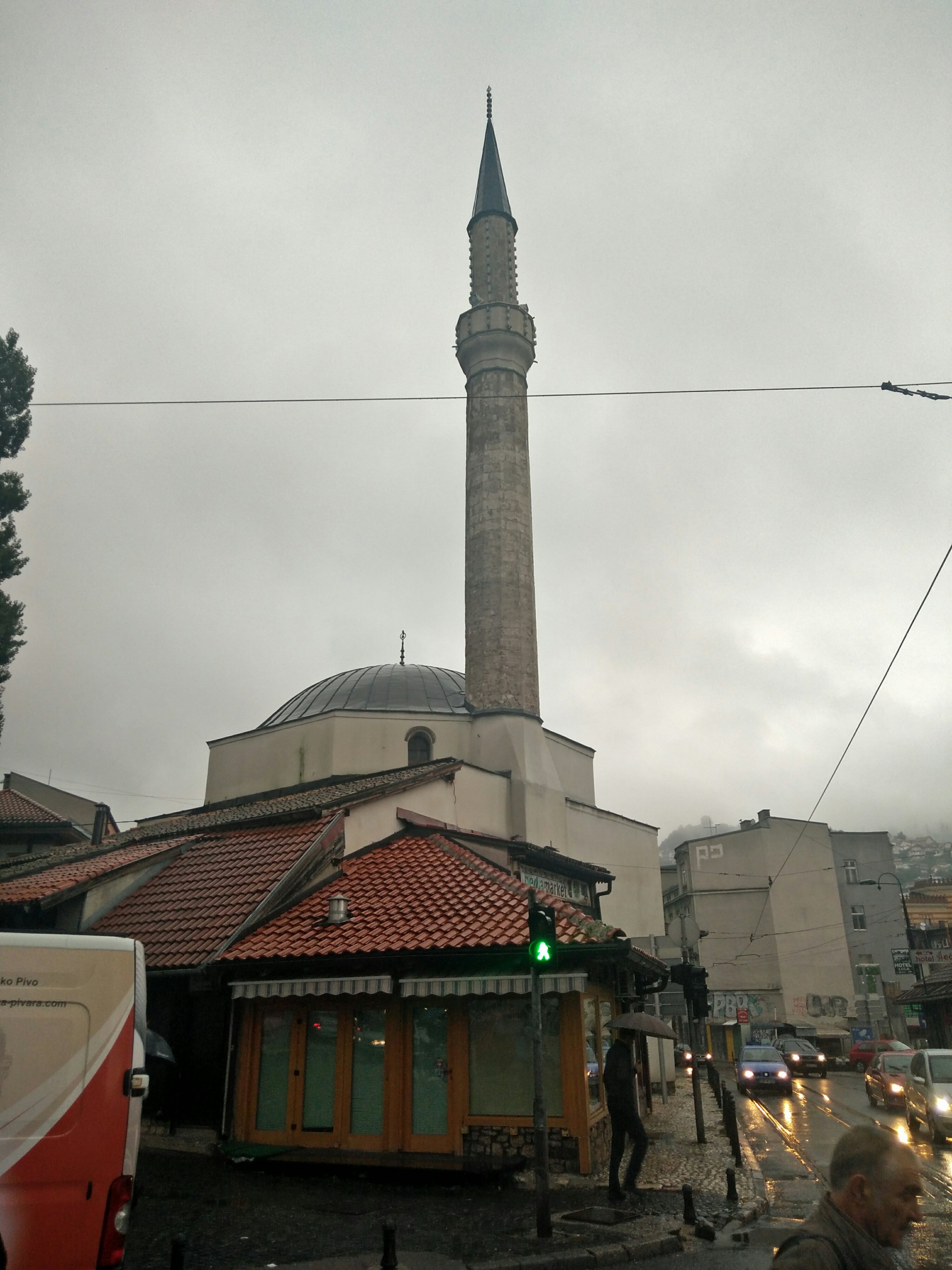 Dennoch kam der Bus etwas zu früh am 19. September in Sarajevo an, gegen 5:30 Uhr (statt 6 Uhr). Immerhin war’s trocken, wenn auch kalt. Nach anfänglicher Orientierung konnten wir in der Dämmerung eine Straßenbahn finden, die uns in die Altstadt brachte. Dort entstand auch dieses Juwel: