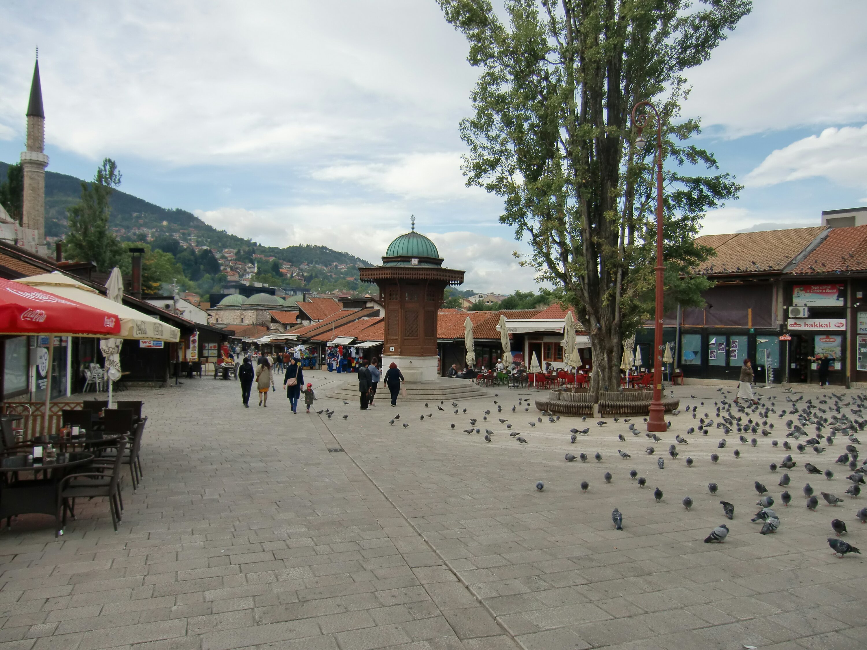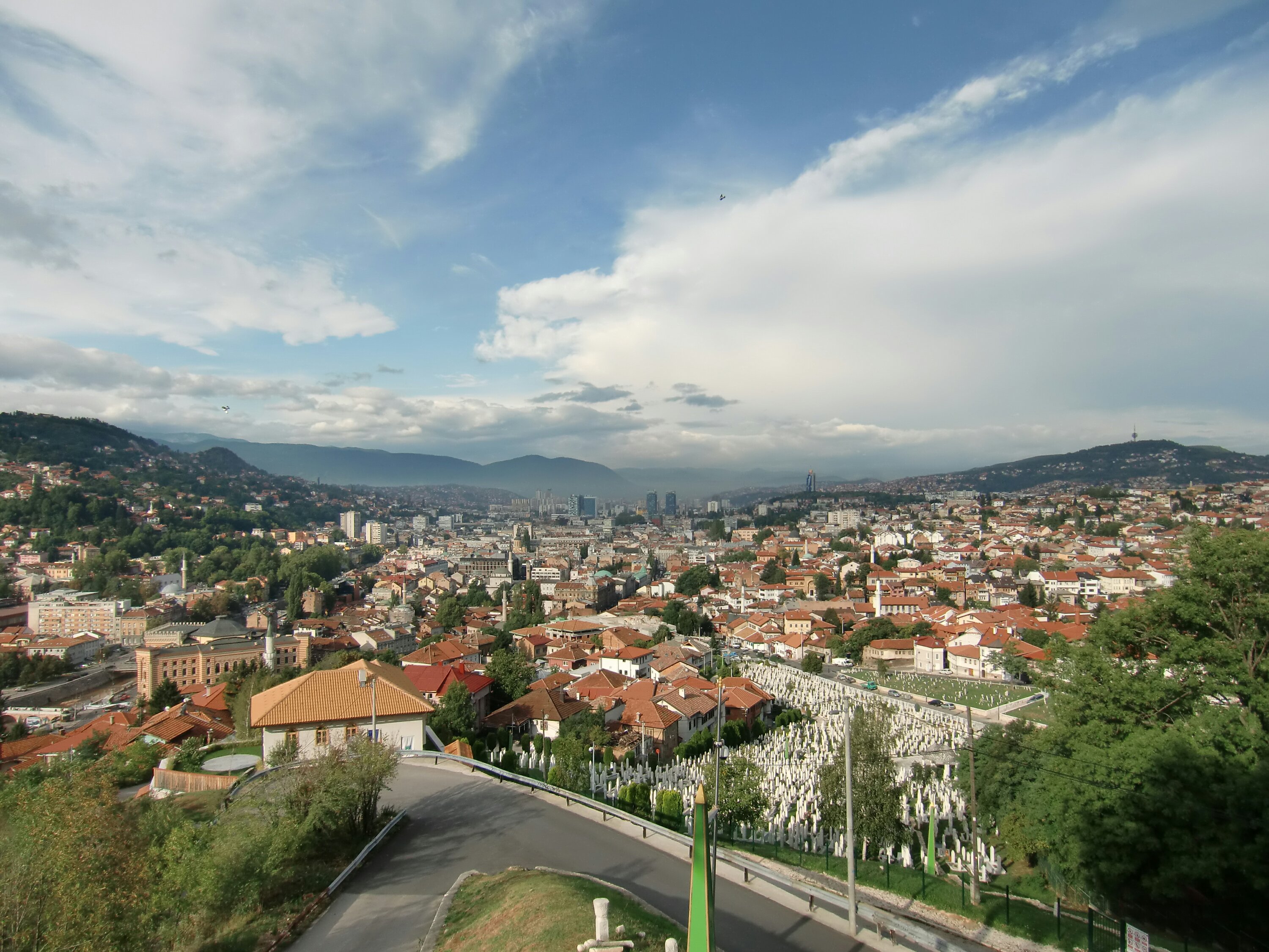 Zum großen Glück konnten wir schon unser Zimmer beziehen (und noch eine Stunde schlafen), bevor wir uns ernsthaft in die Stadt aufmachten. Zum Frühstück verschafften wir uns einen Überblick über Sarajevo: