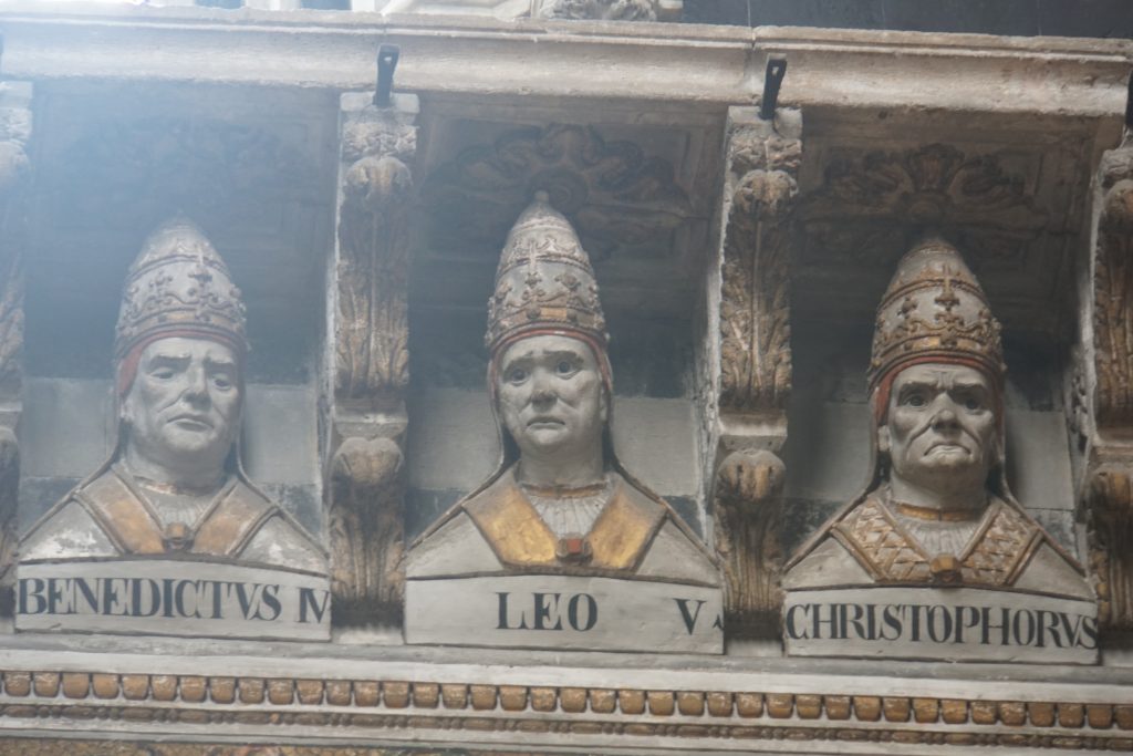 Von oben herab auf das Innere der Kirche blicken dabei eine Reihe von Päpsten – wenn man sich diese etwas genauer anschaut, sehen allerdings gar nicht alle SO unglaublich glücklich darüber, anwesend zu sein – wie unser Freund Leo der Fünfte hier: