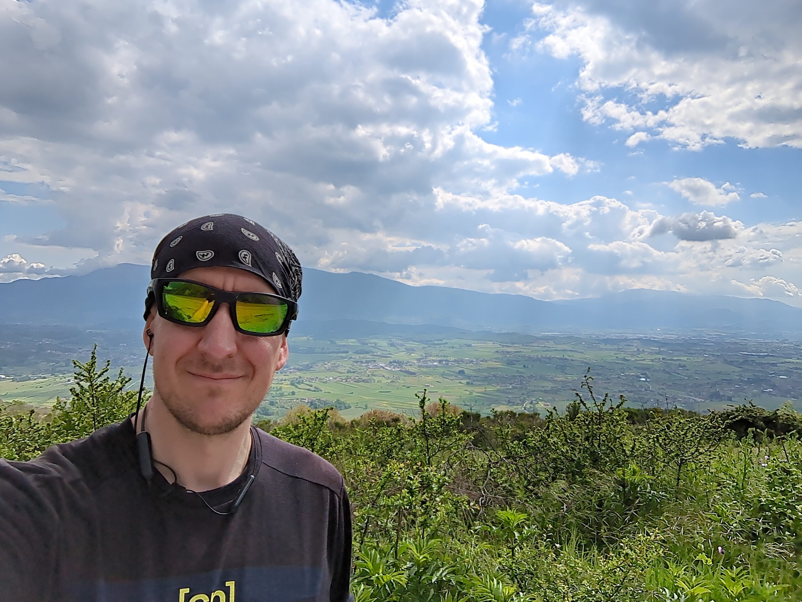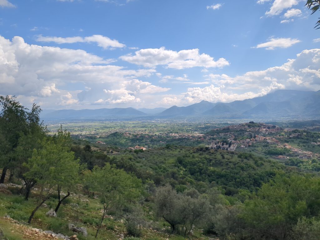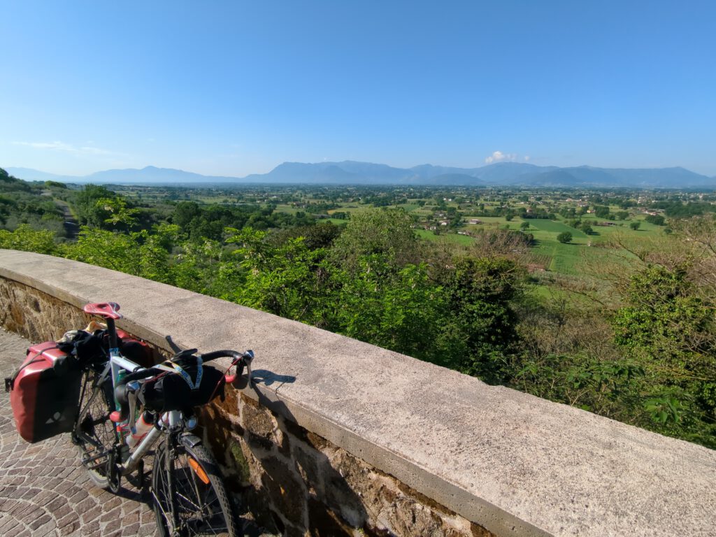 Am Donnerstag, den 4. Mai, schaffte ich es dann wieder einigermaßen früh los, Abfahrt nach dem Frühstück etwa 07:20. Das Hinterrad lief aber immer noch nicht so richtig rund gefühlt. Nächster Gedanke: vielleicht etwas verrutscht, also einmal Luft raus und wieder rein. Ich habe eine Mini-Luftpumpe dabei, die ist aber nur dazu gedacht das Rad fahrfertig zur nächsten richtigen Pumpe zu bringen. Also war ich kurz nach Cassino schon auf der Suche nach einer Tankstelle. Erste Tankstelle: Keine Druckluft. Zweite Tankstelle: Keine Druckluft. Dritte Tankstelle: War wohl mal eine Tankstelle, aber das ist lange her. Vierte Tankstelle: Hey, es gab Druckluft! Beim Drehen des Rads in eine günstige Position sah ich dann das Problem: Der Reifen hatte eine Ausbeulung an der Seite. Das sollte nicht sein. Luft raus, wieder hingedrückt, Luft wieder rein: keine Chance, leichter Riss im Mantel. Muss wohl ersetzt werden, der nächste Fahrradladen war aber weit weg. Also bin ich erstmal weitergefahren, mit Blick auf den Reifen alle paar Kilometer. Davon abgesehen: Es war erst einmal ein wunderbarer Tag! So wunderbar, dass ich nicht nur im T-Shirt fahren konnte, sondern sogar in kurzer Hose!
