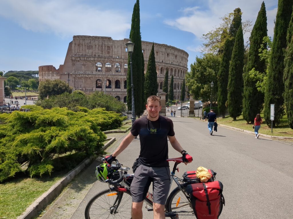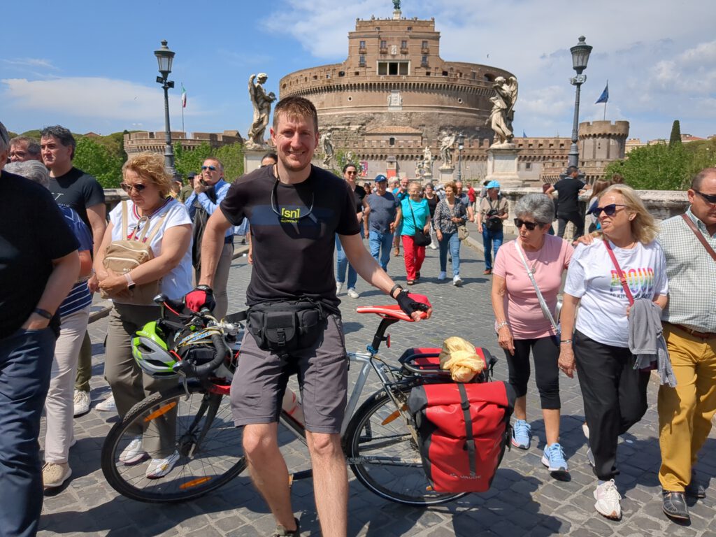 Rom wäre eigentlich ein schöner Zielpunkt der Reise. Die Fahrt vom Kolosseum zur Engelsburg fühlte sich nach einer geradezu poetischen Zieleinfahrt an. Es muss aber weitergehen, denn es waren deutlich mehr als vier Tage Resturlaub übrig. Aber: Der Chef des Mannes, der im Gebäude im Hintergrund meines letzten Fotos wohnt, sagte schon: Am siebten Tage sollst du ruhen. Ganz unabhängig davon sind die Beine inzwischen wirklich etwas müde, wie ich beim Treppensteigen merke, und Regeneration sollte nicht vernachlässigt werden. Also verbringe ich einen Ruhetag in Rom.