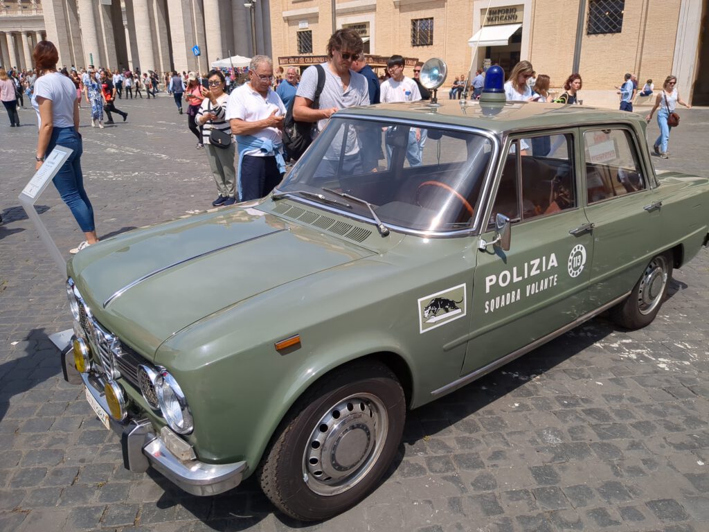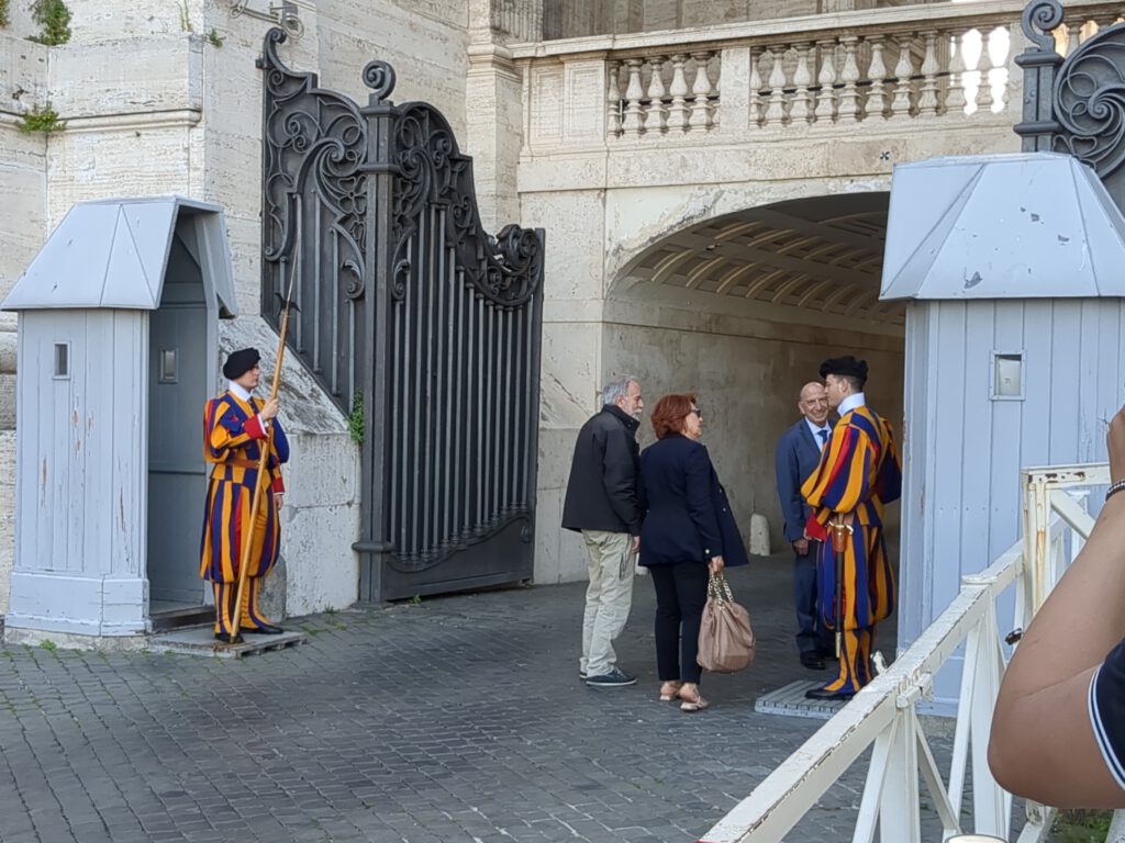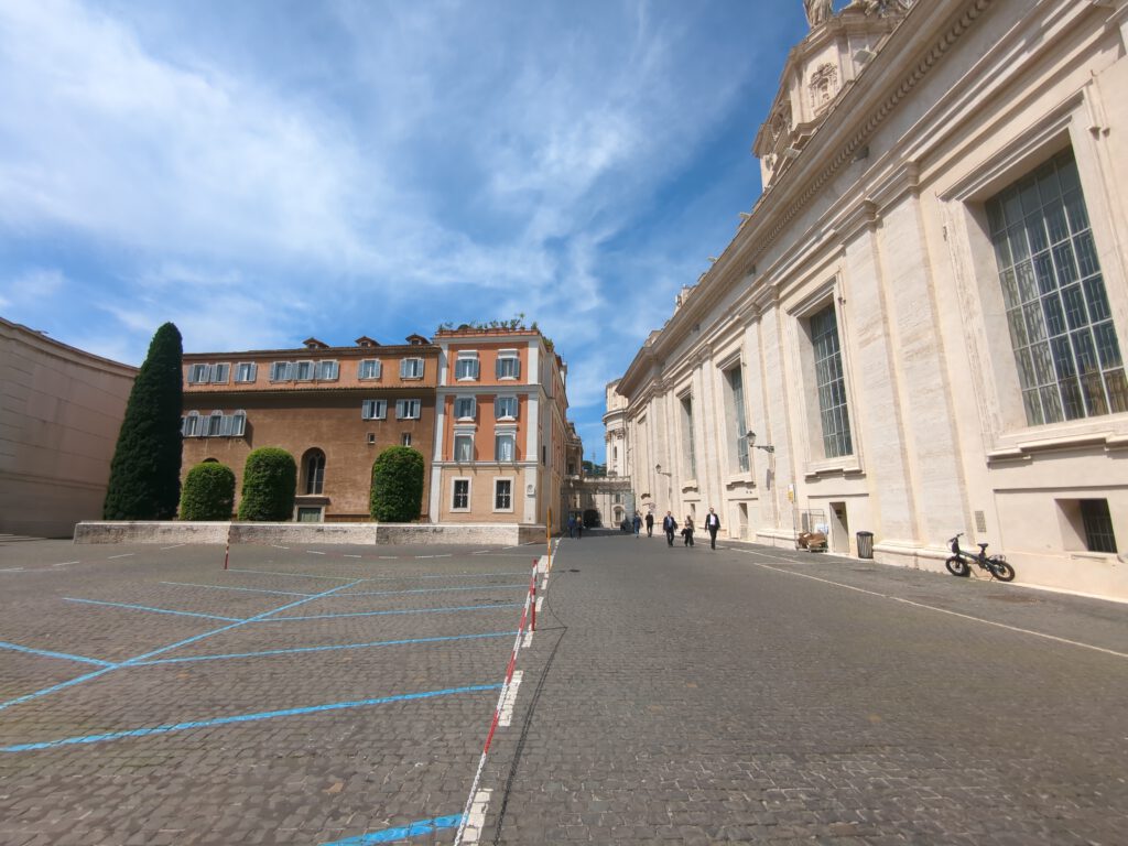 Dazu gehörte sinngemäß als erstes, für Samstag, den 6. Mai, einmal keinen Wecker stellen zu müssen. Ein bisschen überrascht war ich dann aber schon, über 10 Stunden geschlafen zu haben. Als erstes also wieder zum Petersplatz. Viel zu voll. Die Schlange für den Dom reichte einmal komplett um den Platz. Nope, nicht mit mir. Stattdessen entschied ich mich, einem Geheimtipp zu folgen, von dem ich letztes Jahr mal gelesen hatte: Links hinter den Säulen des Platzes auf die Schweizer Gardisten zugehen, und auf Deutsch (der Teil ist wichtig) um Einlass zum Friedhof bitten. Wie sich herausstellte, funktioniert das. Man darf dann den abgesperrten Bereich betreten und läuft ein Stück neben dem Petersdom entlang.