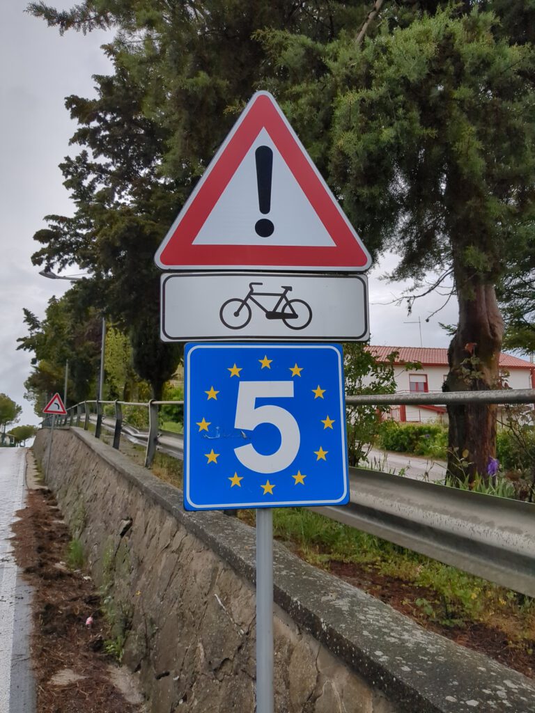 Etwas googlen dazu ergibt: der Route folge ich schon seit dem Vortag, und bin ihr den Rest des Tages wohl auch gefolgt. Außer um Monteleone herum habe ich nirgends Schilder gesehen – dort dafür bestimmt 20. Sollte man nach 100 Metern vergessen haben, wo man ist. Oder es gab eine Vorgabe der Art „30 Schilder für die Eurovelo 5 aufstellen“ und die Deadline nahte.