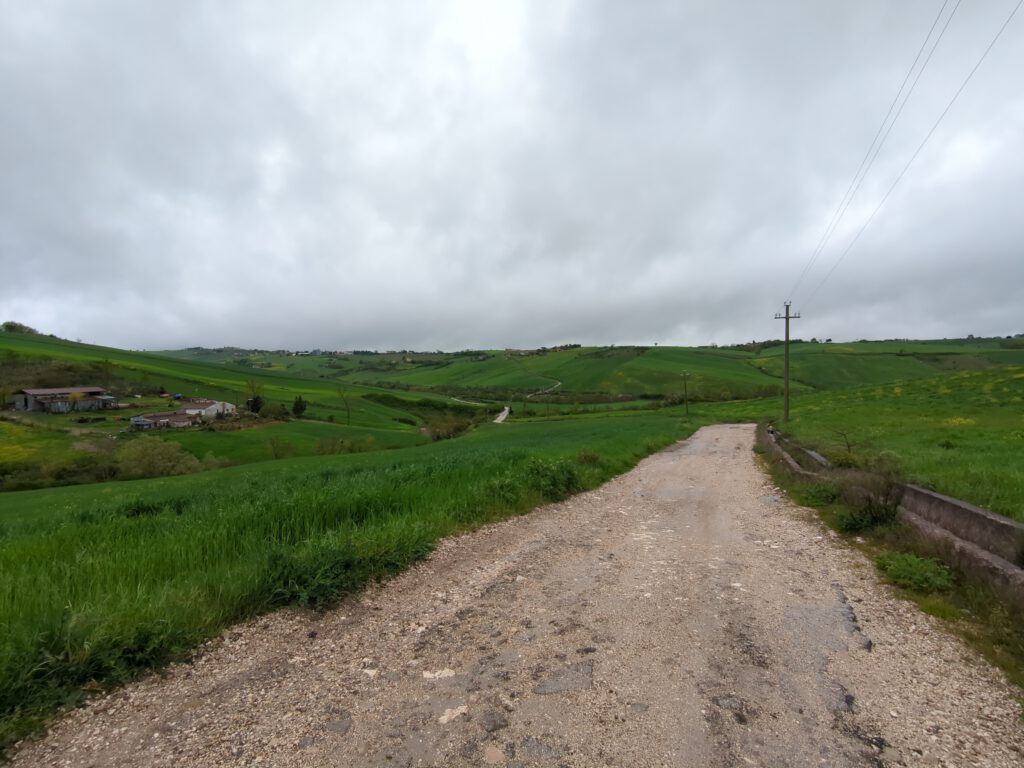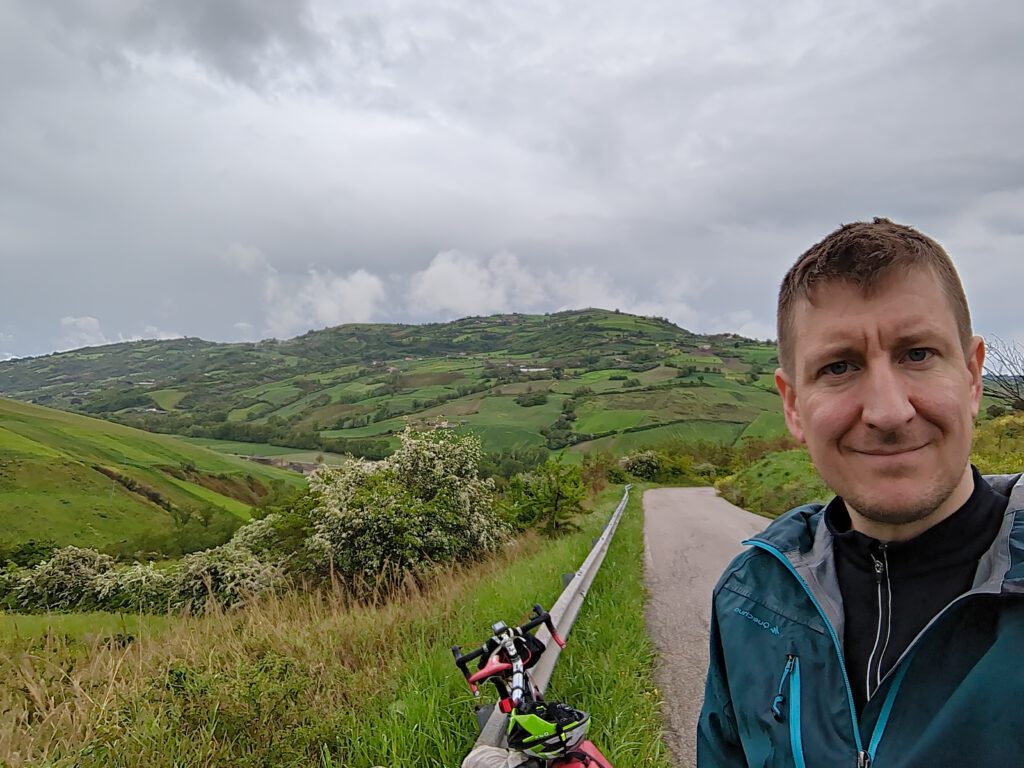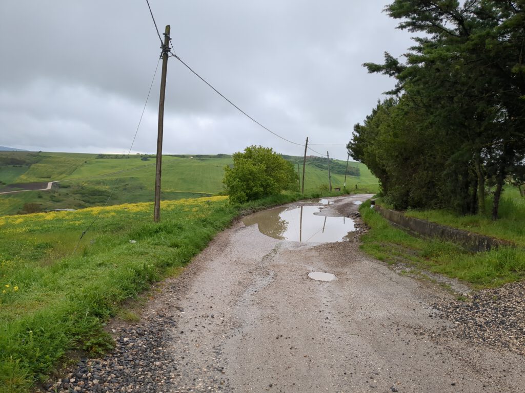 Nicht gerade einen blauen Himmel, aber mehr als 50 Meter Sicht. Nehme ich! Auf der Suche nach dem italienischen Frühstück (Kaffee und Croissant) in der einzigen Bar des Ortes sehe ich auch ein wenig von der kleinen Stadt – ja, tatsächlich ganz nett! Nach zusammenpacken und Frühstück fahre ich gegen 8 Uhr aus Monteleone los. Auf der Straße stehen etwa alle 100 Meter Warnschilder, dass man sich auf der Eurovelo-Route 5 befindet.
