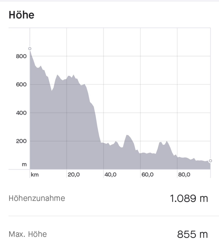 Der generelle Abwärtstrend sollte übrigens nicht darüber hinwegtäuschen, dass ich trotzdem noch 1000 Höhenmeter klettern musste – bevor hier irgendwer auf die Idee kommt, ich wäre hier bei der Planung gänzlich unambitioniert gewesen!