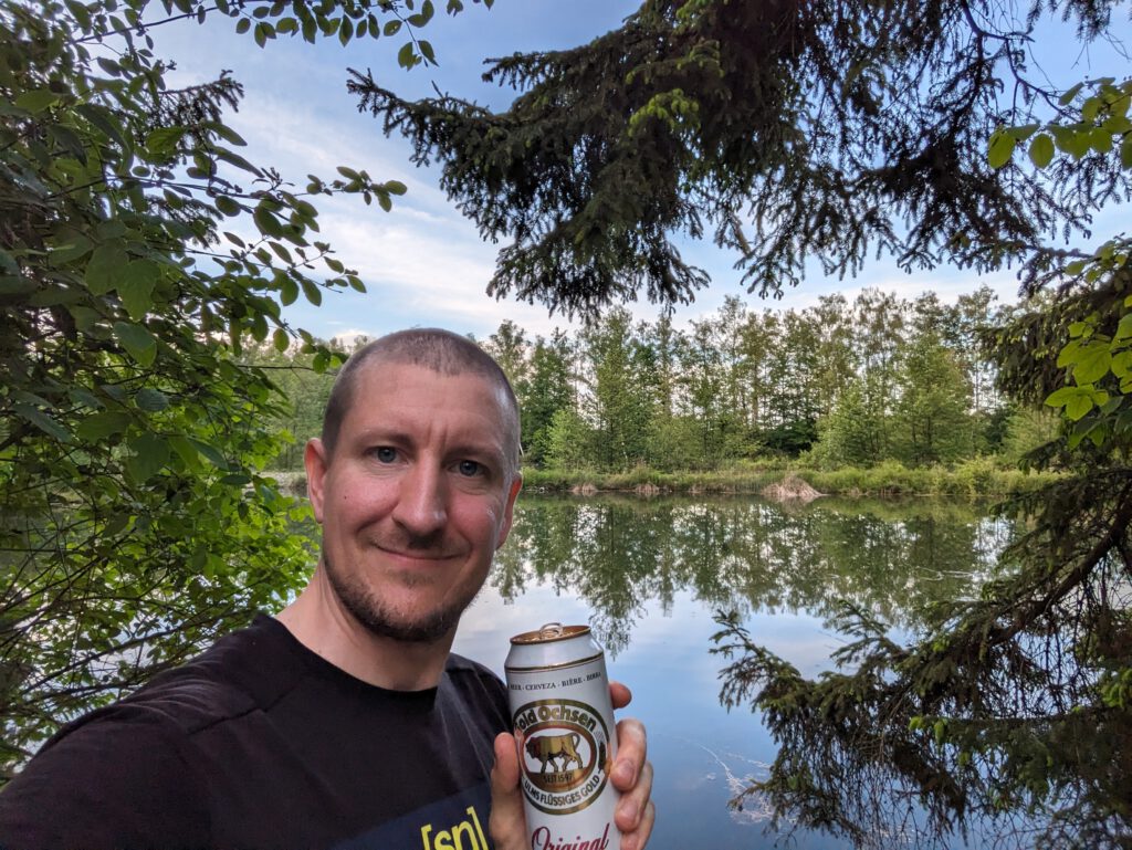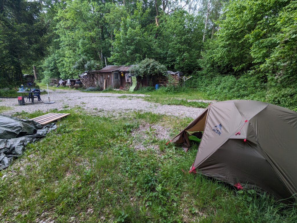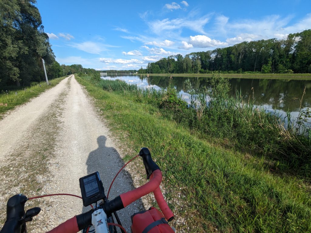 Die Donau, die ich ein Stück östlich von Ulm erreichte. So ziemlich genau bei Kilometer 2566. Ich war also nicht in Ulm oder um Ulm, sondern eher um Ulm herum gefahren. Es war jetzt etwa 18 Uhr, ich war taktisch klug im letzten Supermarkt in BW noch vorher einkaufen (Auf Bayerns Öffnungszeiten falle ich so schnell nicht nochmal rein….), und so galt es langsam aber sicher Ausschau nach einem Quartier für die Nacht zu halten. Und das gestaltete sich aufgrund diverser Natur- und Landschaftsschutzgebiete gar nicht so einfach! Irgendwann gegen 19 Uhr hatte ich einen potentiellen Platz entdeckt – und schon kam ein älterer Mann mit Hund ums Eck. Beim wild campen sucht man eher Plätze, die weniger stark frequentiert sind… Allerdings handelte es sich hier um einen echten Glücksfall: Der gute fragte mich direkt ob ich gerade nach einem Platz zum Schlafen suchte, da er früher auch oft wild gecampt habe – und bot mir an, dass ich auf seinem Grundstück am See mein Zelt aufschlagen durfte.