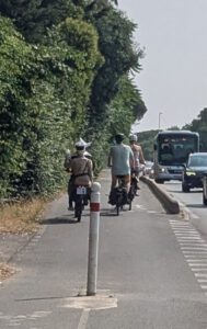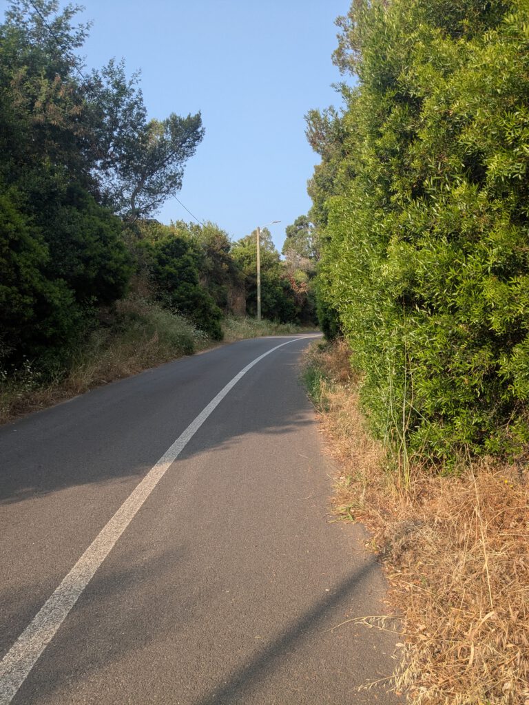 Die gute war ziemlich fix unterwegs, es war entweder ein E-Bike oder Mofa. Ich radelte so schnell wie möglich hinterher, um zumindest mit viel Zoom noch ein Foto vom bekannten Gendarm von Saint-Tropez (wer ihn nicht kennt, sollte die Bildungslücke wirklich schließen) beim nächsten Überholvorgang zu schießen: