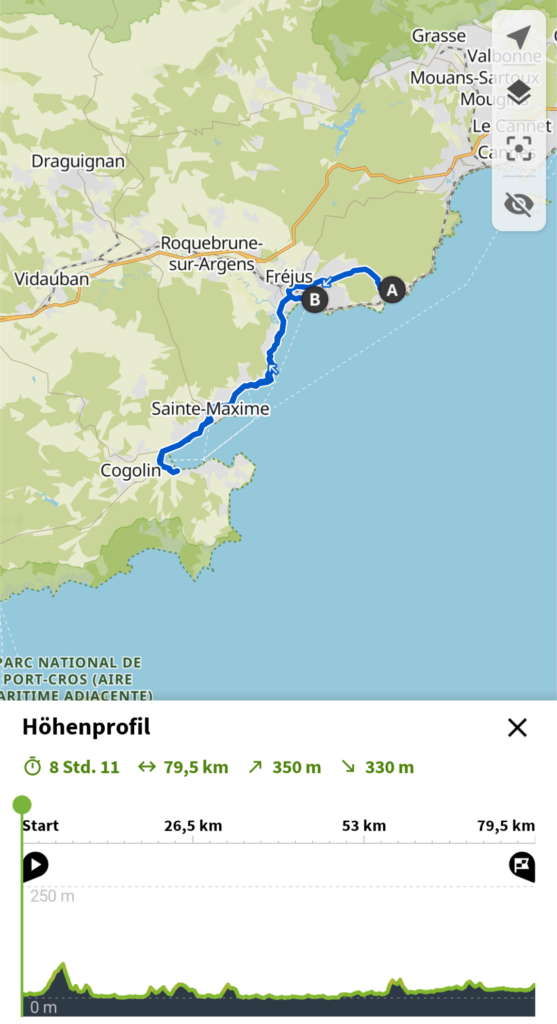 Am Dienstag, 10. Juni, sollte der vorletzte Fahrradtag anstehen. Von Agay aus sind es 180km bis Marseille, was auch bei warmen Temperaturen gut machbar sein sollte. Auch wenn vor Marseille noch einmal ein 400 Meter hoher Alpenausläufer zu überwinden sein sollte.
